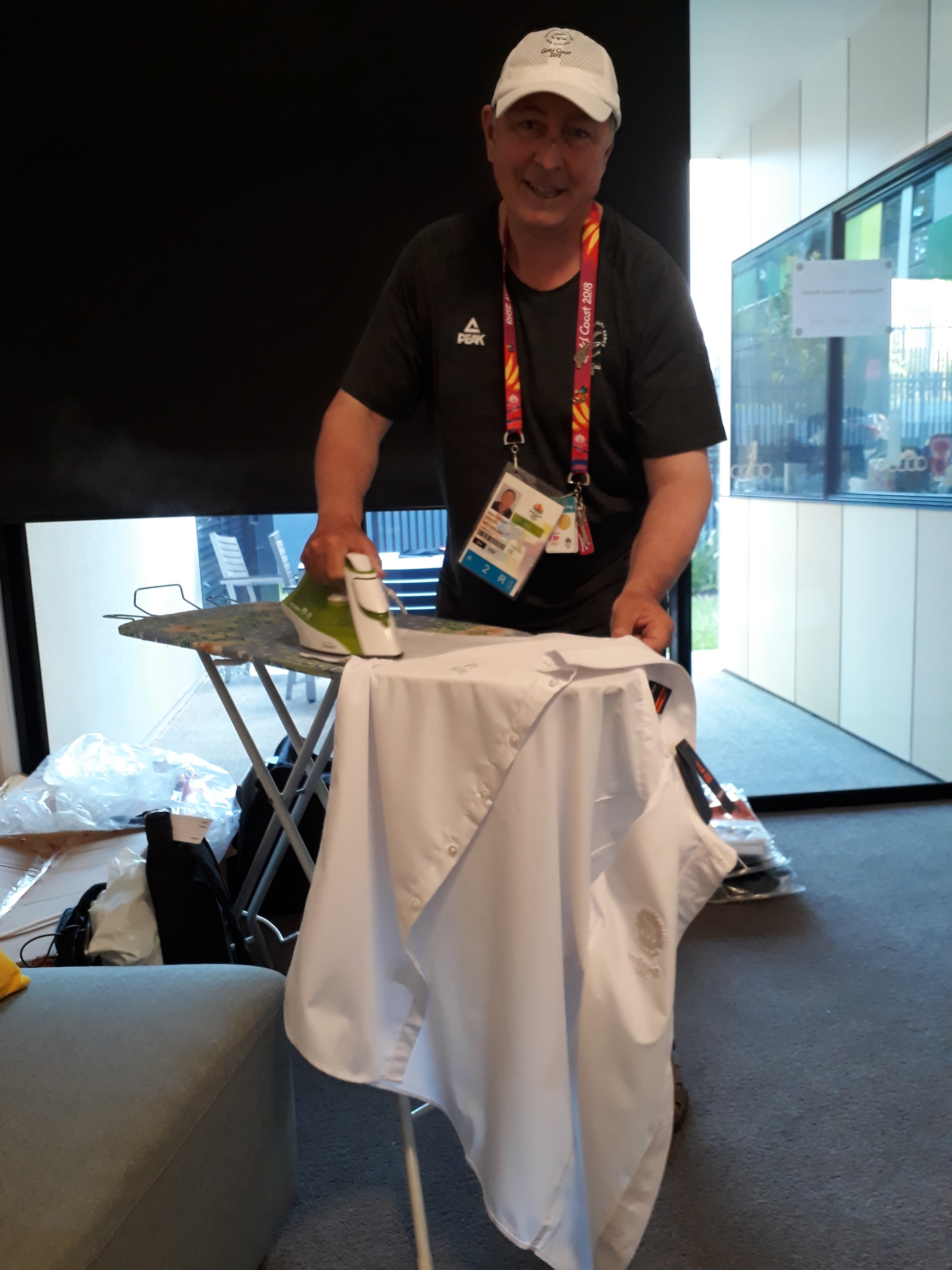Also the volunteers are great, running shuttle vans out to the range and back, putting up shade tents to store gear and to get out of the sun or showers between shoots and they have cold water and tea and snacks etc. Mostly locals so we know a lot of them which makes it more enjoyable.Tomorrow is the opening Ceremony, so we have to get a bit of kit together. The photo shows Brian ironing my shirt in Rob Wardell's (Chef de mission)!! bedroom.